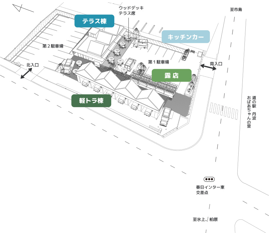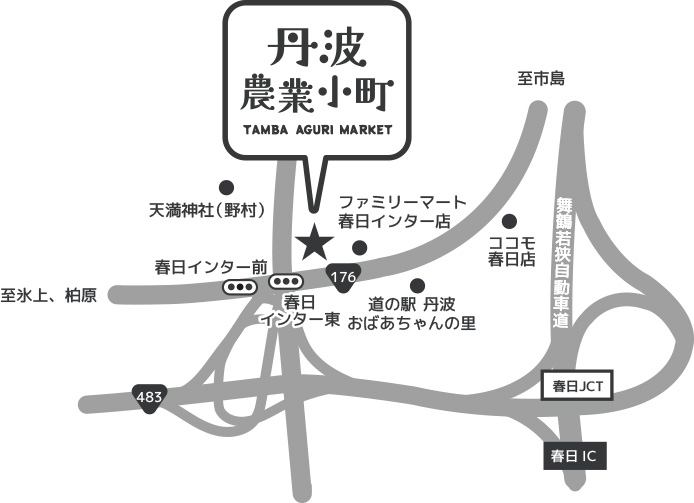 高速道路春日IC(北近畿道・舞鶴若狭自動車道)より「春日インター前」の信号を右折 国道176号線「春日インター東」の信号すぐ横。